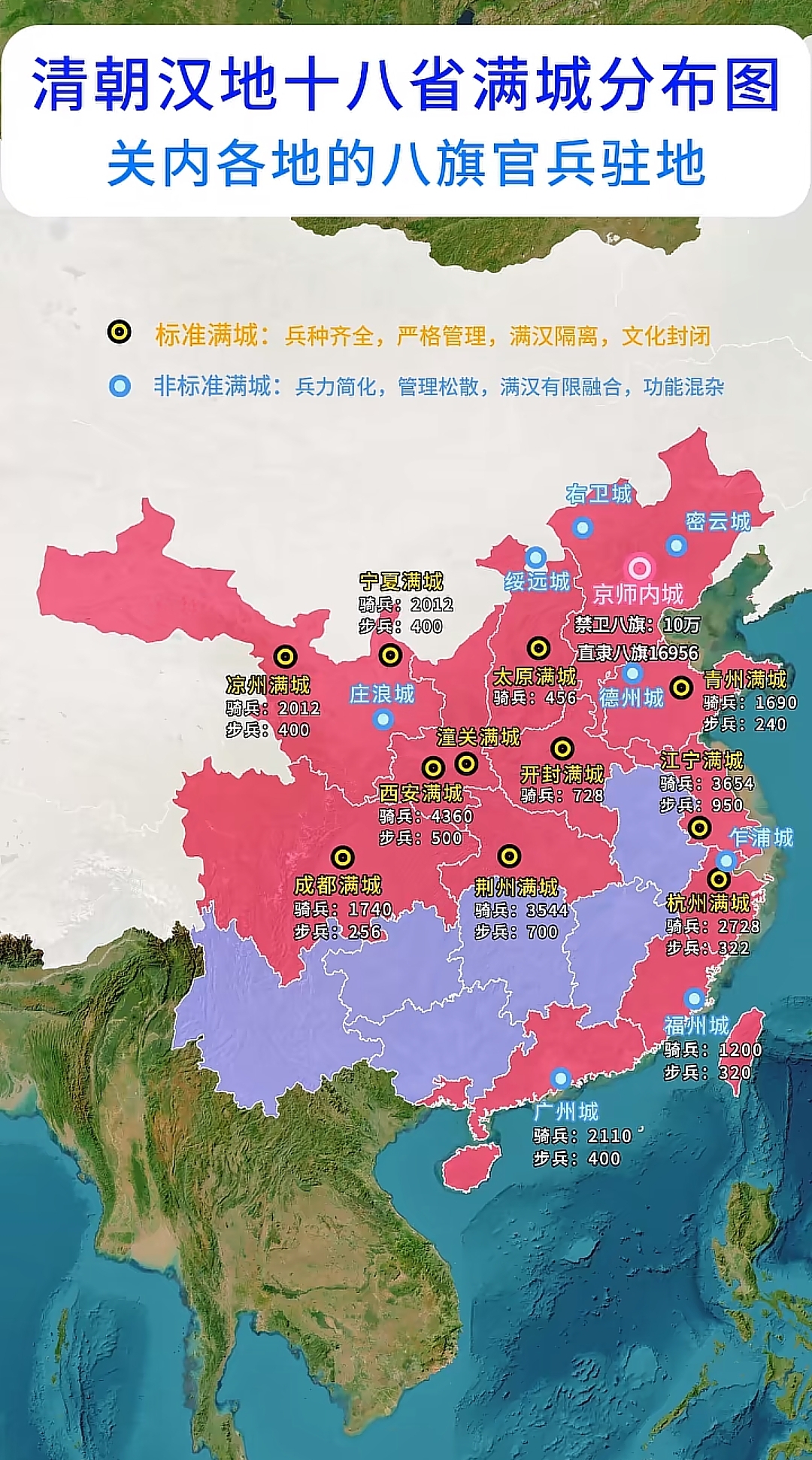 满清时期的满城分布 4个月前 (12-07) 分类:好文收藏 阅读(763) 满城:为了防汉抑汉奴隶汉人建立的,便于施行满清奴隶制,建立的类似托克索农庄,柳条边,米肉人菜。上学时,历史书上说太平天国动摇了满清在东南的统治根基,当年很困惑怎么动摇的,其实就是把满城杀穿了,南方没了八旗 ! 未经允许不得转载:追梦的大鹏 » 满清时期的满城分布